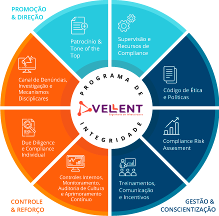 Estar em consenso com as normas, controles, políticas e diretrizes estabelecidas para o negócio faz parte da cultura da VELLENT desde a sua fundação. Através do programa de Integridade, a empresa reafirma a transparência de suas ações e seu compromisso com a postura e a ética nos serviços prestados.